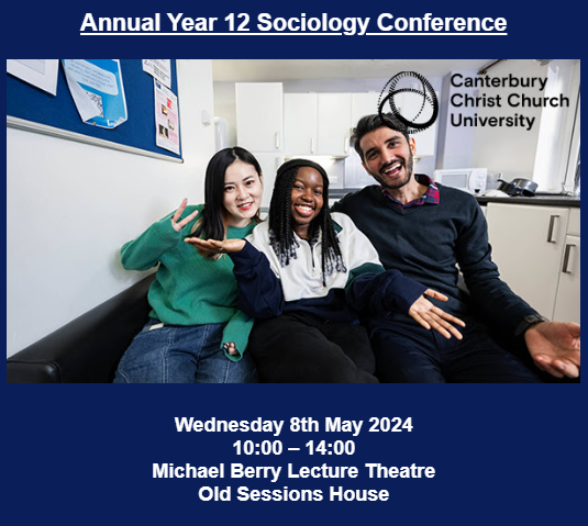 Dr Matt Ogilvie from Sociology at Canterbury Christ Church University would like to invite you to our annual Year 12 Sociology Conference on Wednesday 8th May. For information on the day please see the schedule below: