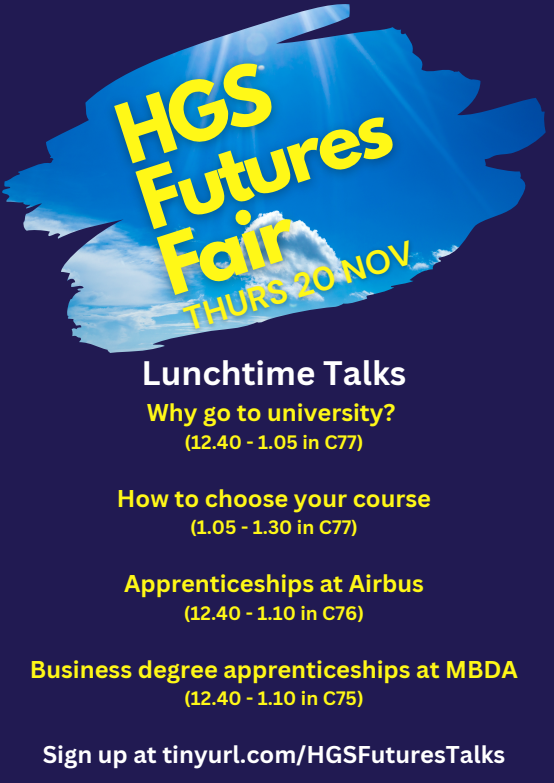 There is lots to look forward to next week, with the Futures Fair, the Years 7 and 10 Meet the Tutor Evening, the next Senior Maths Challenge, 'Brain Day' for Year 13 Psychology students, and the North Herts Primary Transition Conference, which we will host on Friday.