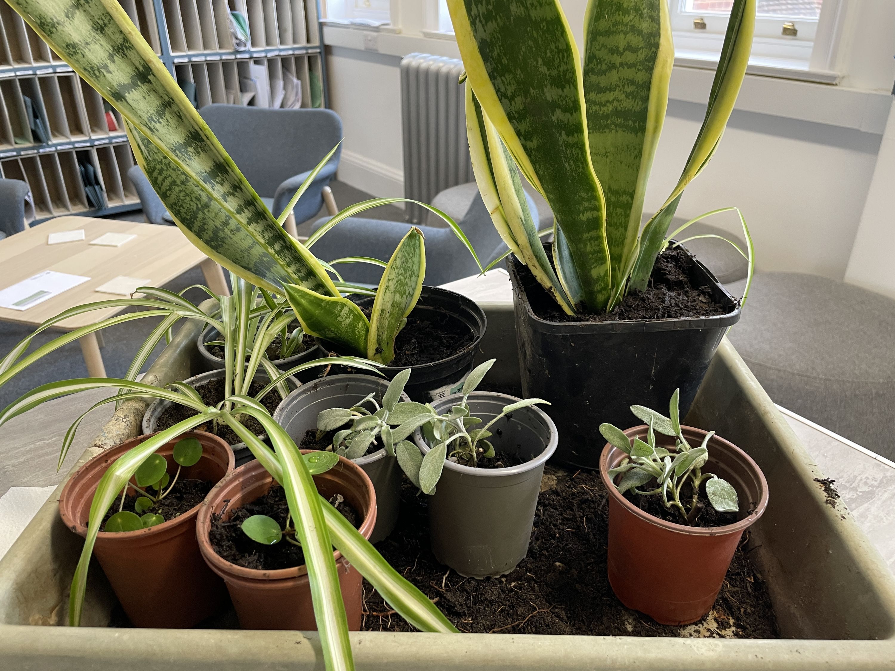 Turning our school greener, one classroom at a time: Eco Club split and propagated these plants, including sage from Emily's Garden and air-purifying Snake Plant, which have now been rehomed in classrooms.