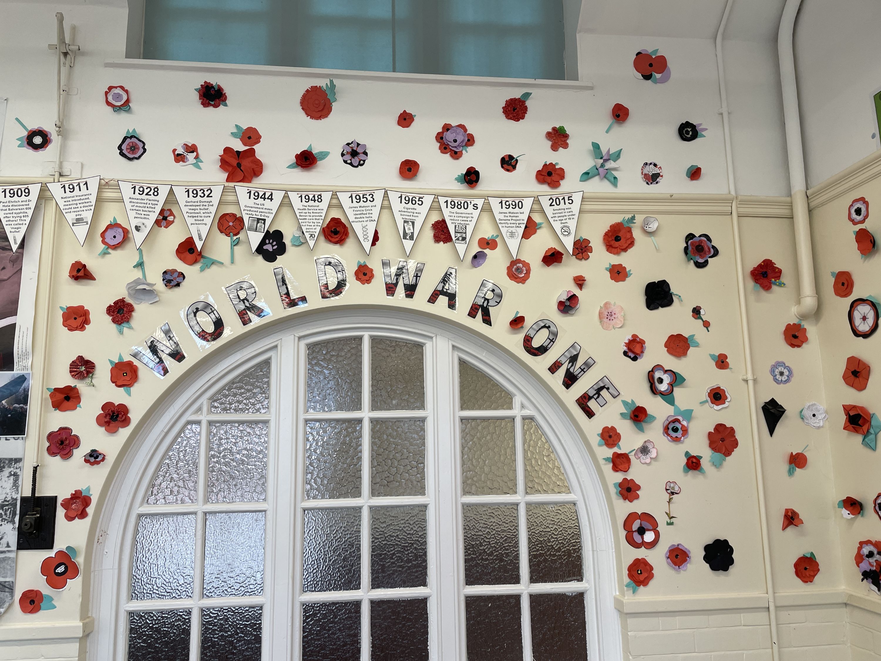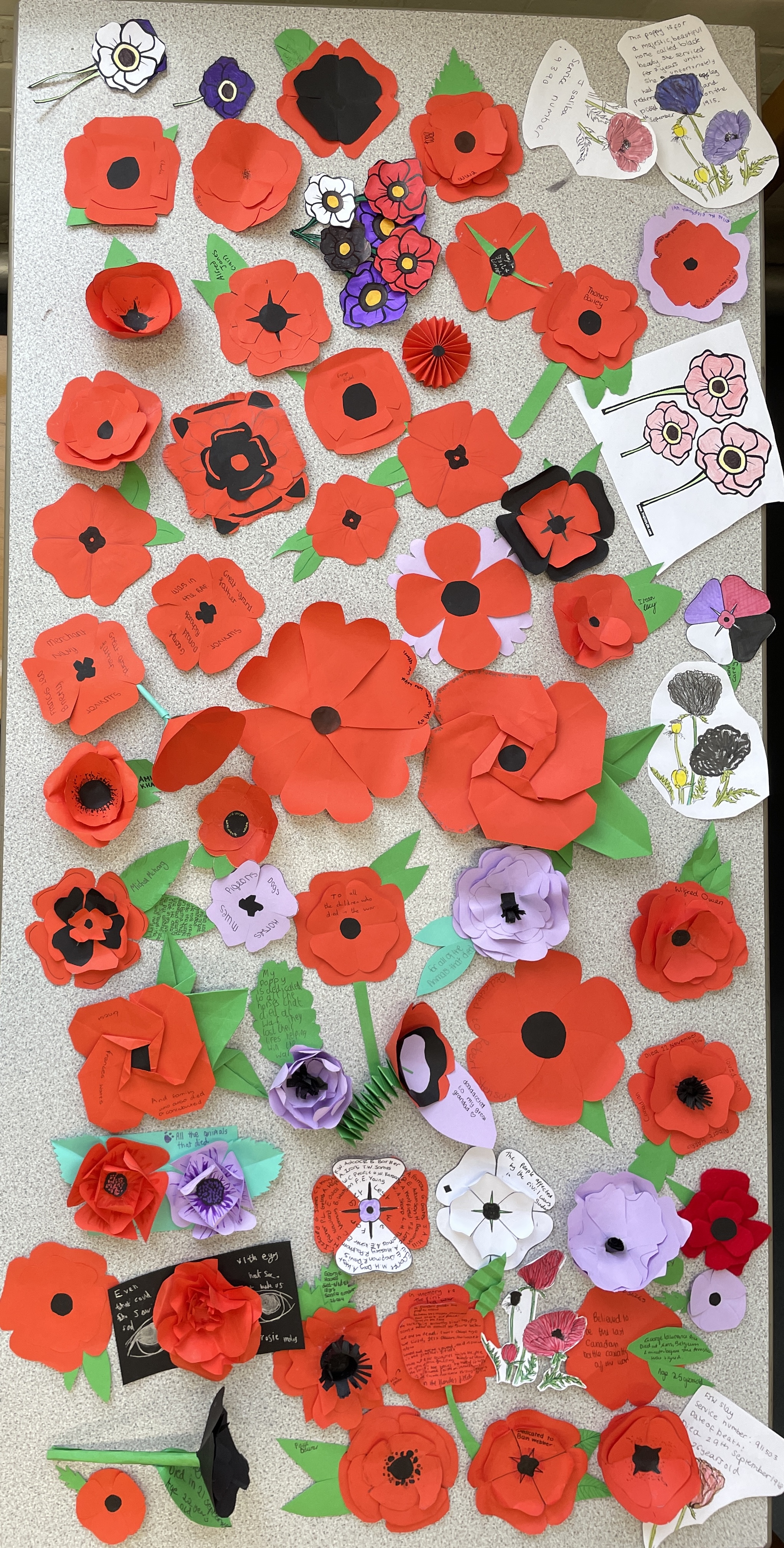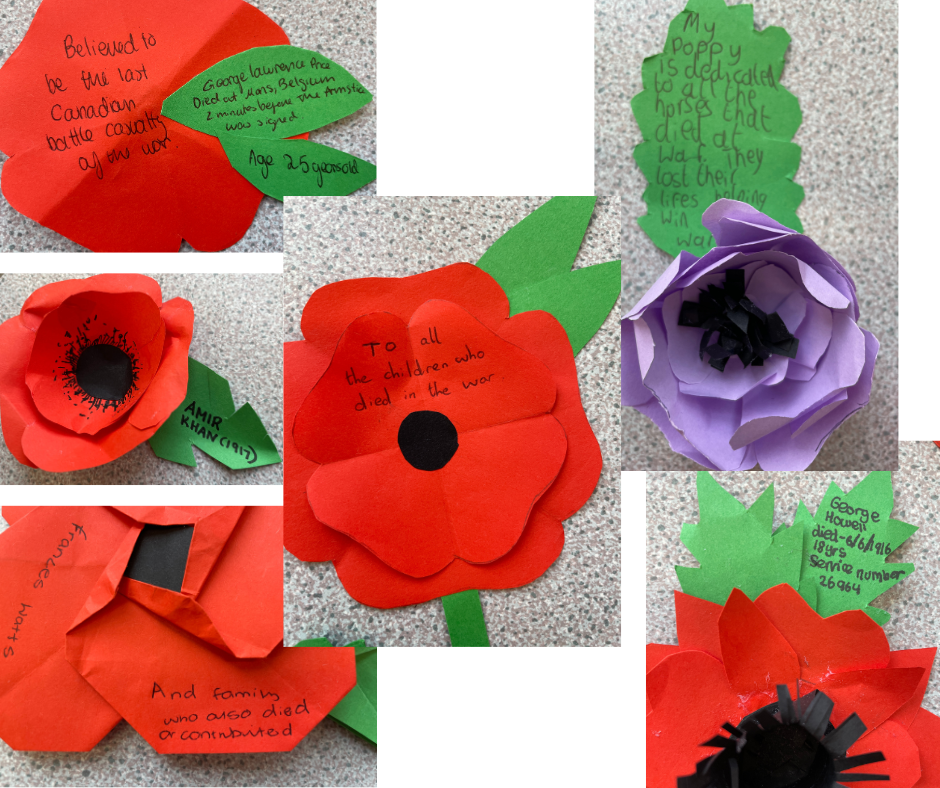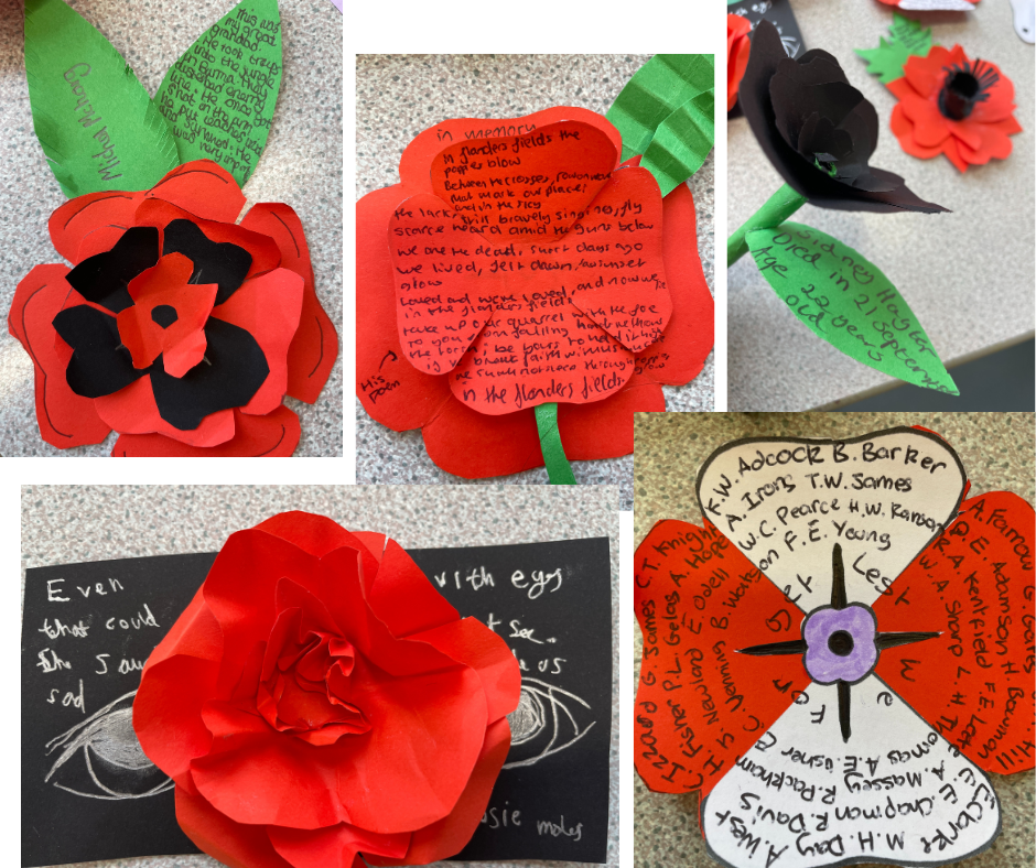 Dedications to individuals who died in World War I by our Year 9 History students. They each made a poppy and chose whom to dedicate it to, be it someone in their family who lost their life in the conflict, or a person they found out about through researching the Commonwealth War Graves.