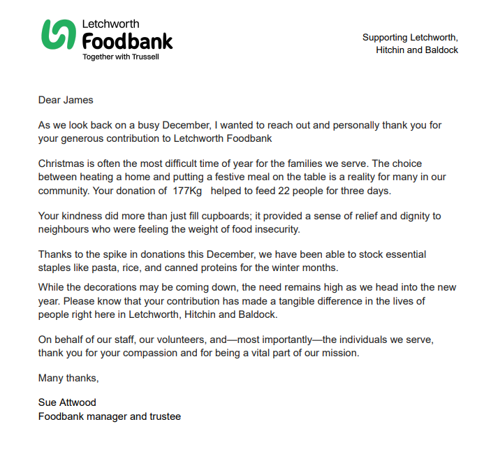 We received this lovely letter following our Christmas Food Drive last month, which refers to the tangible benefits of the donations we were collectively able to make as a school. Thank you again to all those who brought in contributions.