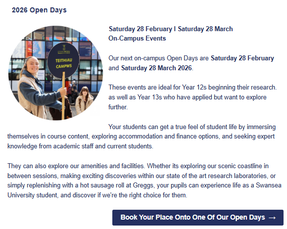 Both days run from 11:00 to 16:00, with registration from 10:30, and are free to attend. The days will include an admissions talk, subject taster sessions, a college tour, lunch and a short parent/supporter programme.