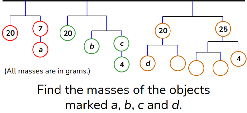 If any parents would like to try their hand at the kind of problem our Year 7s were posed - see the image below. This shows a mobile, in which the two sides must be balanced. Can you work out the missing masses?